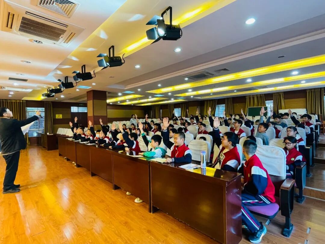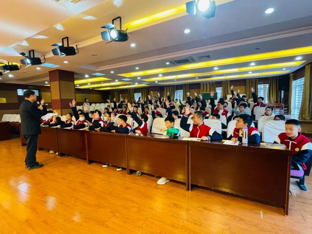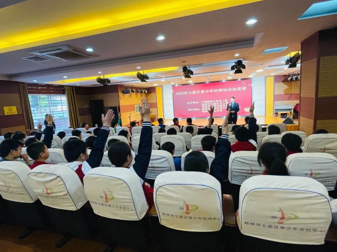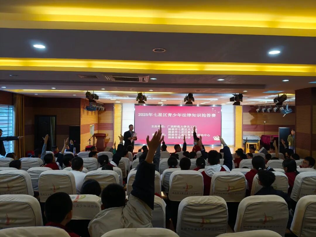 在2025年“宪法宣传周”启动之际,为迎接第十二个“12·4”全国法制宣传日,12月1日,由广西师范大学关工委、桂林市七星区关工委和区教育局主办,区青少年活动中心和穿山中学承办的“2025年七星区青少年法律知识抢答赛”在活动中心演艺厅圆满落幕。此次活动精准对接青少年法治教育需求,为即将到来的全国法制宣传日营造了浓厚氛围,广西师大“五老”专家黄仁同副教授主持抢答赛活动,活动中心和穿山中学150名师生共同参与这场法治盛宴。